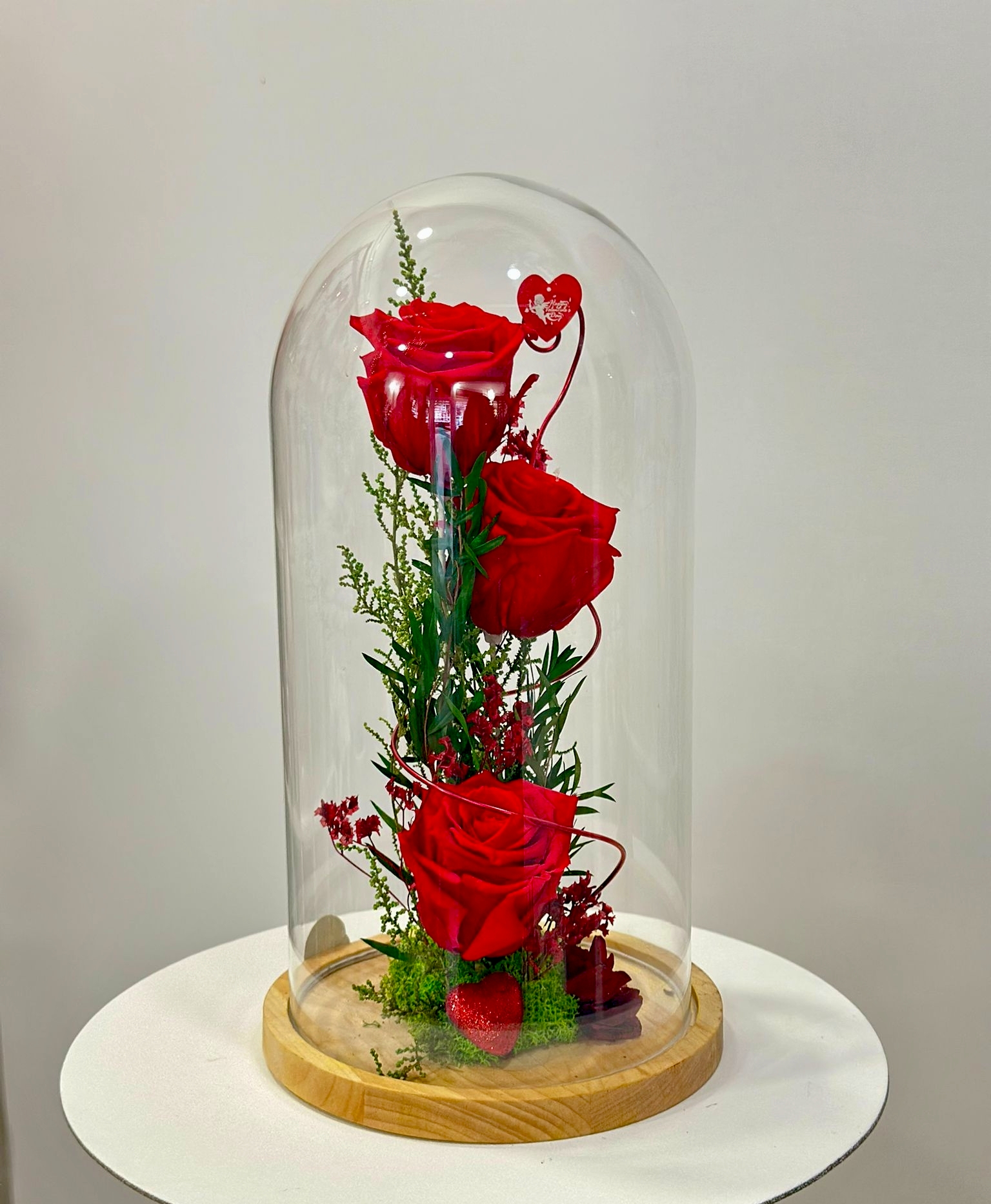 Tres rosas rojas preservadas, símbolo de amor eterno, protegidas en una elegante cúpula que conserva su belleza por años.